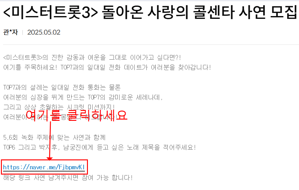 - 공식 홈페이지 접수: TV조선 ‘사랑의 콜센타 세븐스타즈’ 게시판을 통해 사연 작성