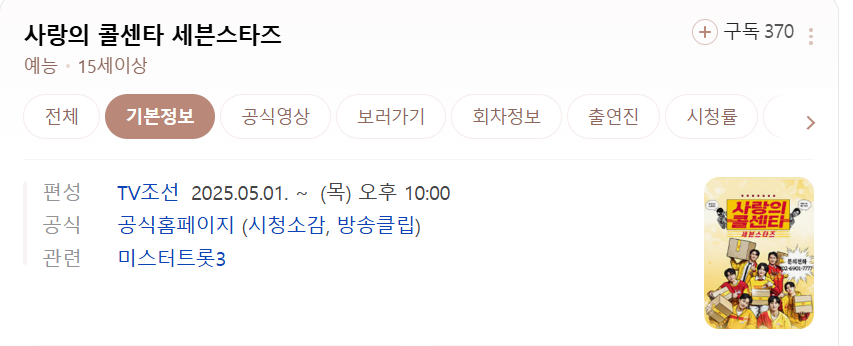 TV조선의 대표 트로트 예능 프로그램, ‘사랑의 콜센타 세븐스타즈’는 매주 목요일 밤 10시에 본방송됩니다. 최근 첫 방송에서는 시청률 5.5%를 기록하며 동시간대 예능 1위를 차지했을 만큼, 인기와 기대가 높습니다. 퀵서비스, 팬과의 전화 연결, 깜짝 고백 등 다양한 구성으로 본방사수할 이유가 충분합니다.