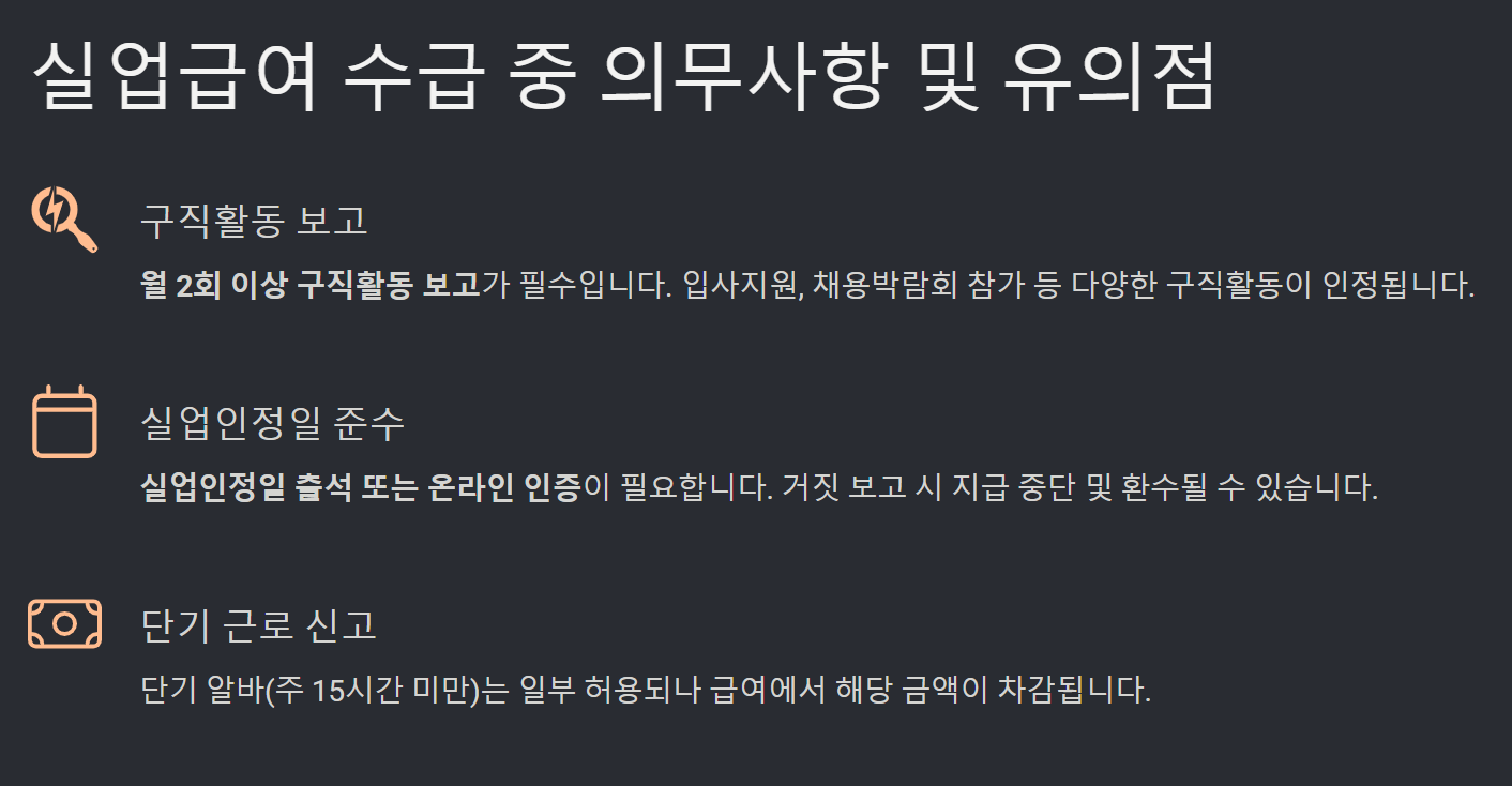 - 수급자격 인정 후에도 정기적으로 '실업인정일 출석 또는 온라인 인증'이 필수입니다.