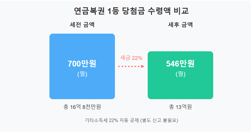 연금복권 실수령액은 기타소득세 22%가 적용되기 때문에 1등 기준 매월 약 154만 원이 세금으로 나가요. 20년간 누적하면 3억 6천만 원 이상이 세금으로 빠지는 셈이죠.