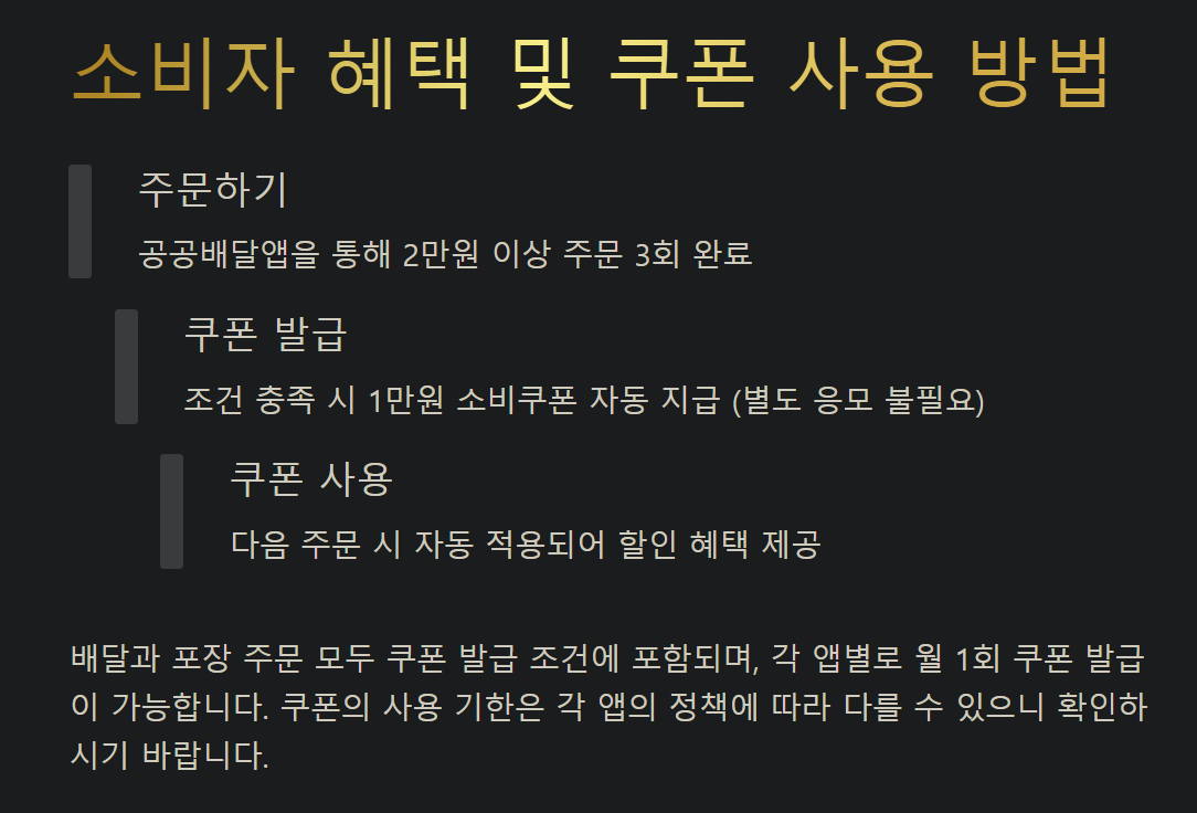 - 혜택: 2만원 이상 3회 주문 시, 1만원 소비쿠폰 지급 (배달/포장 모두 가능)